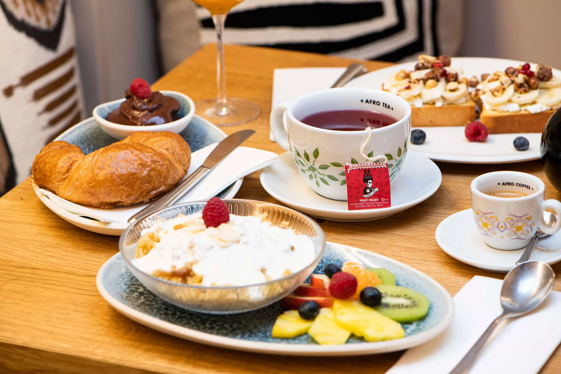 Am besten startet man mit einem guten Frühstück in den Tag. Die Zutaten bei uns sind natürlich und regional, die Rezepte nehmen Dich mit in die vielfältige Geschmackswelt Afrikas. Dazu gibt‘s Afro Coffee direkt aus der Wiege des Kaffees, einen der 15 Afro Teas oder einen erfrischenden Smoothie. Oder alle 3? Frühstück gibt’s unter der Woche bis 11:30, am Samstag sogar bis 14 Uhr.